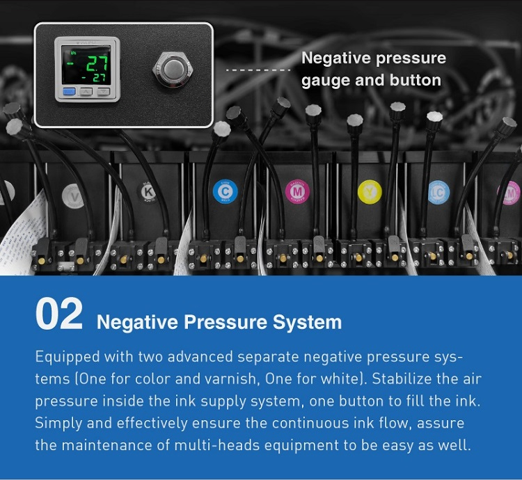 Ink Supply System | Two advanced separate negative pressure systems (One for color and varnish, One for white). | |||