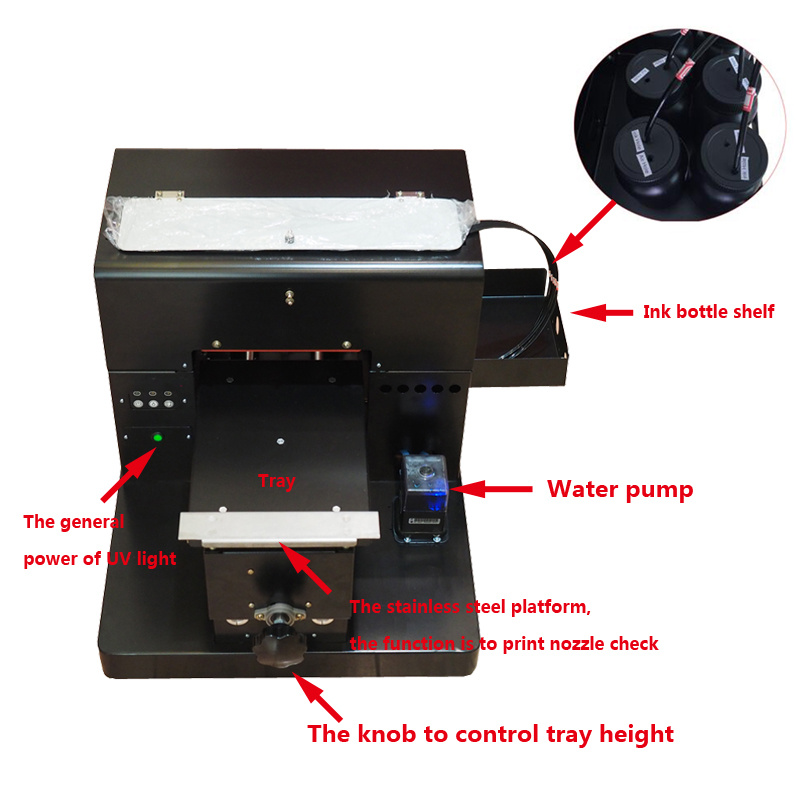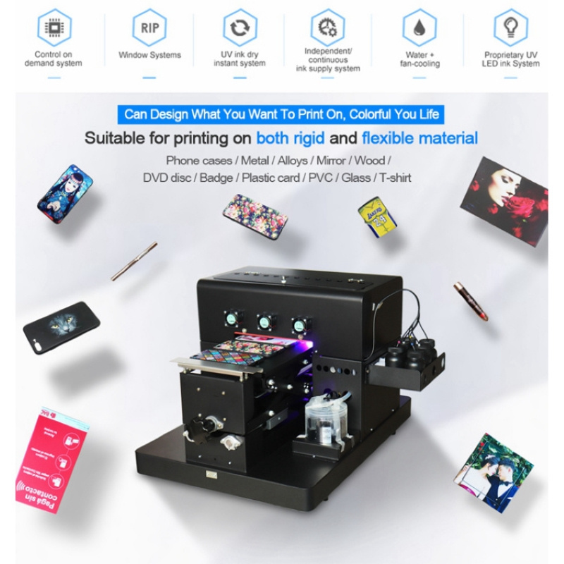 A4 UV Flatbed Printer: Suitable for printing on Both Rigid and Flexible materials:Wood, Metal, Plastic, Glass, Ceramics, Acrylic, LeatherBottle, Cup, Pen, Ball, Card, Phone Case, Garment, ShoesCan Print On Any Material Surface, Water-proof, UV-proof, Scratch-proof.