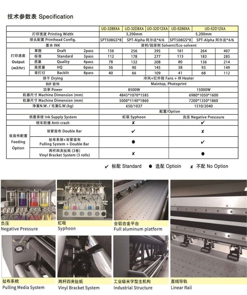 Phaeton 3.2m Digital Large Format Eco Solvent Printer UD-3288XA:1, with SPT 508GS Print Head.2, the SPT 508GS industrial print head with long working life and high production.3, 4 or 8 print heads are optional.